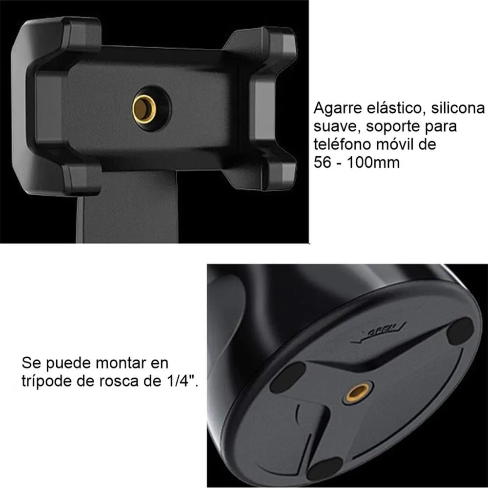 Compacto, estable y fácil de transportar. Su base antideslizante y su soporte ajustable te permiten grabar contenido vertical u horizontal con total libertad.